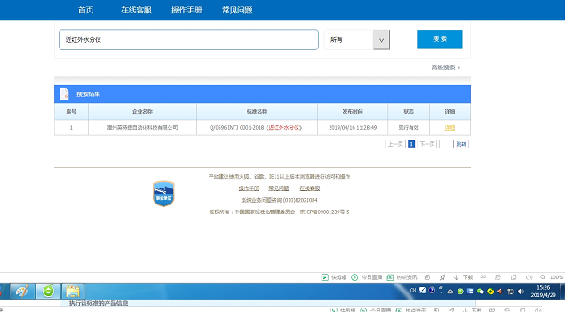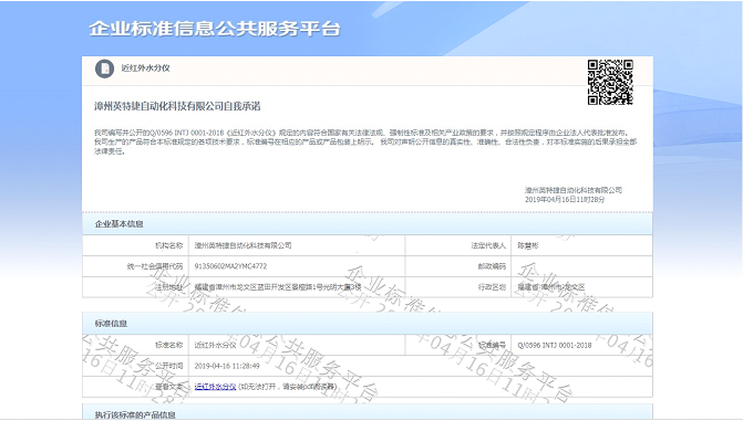 英特捷公司在企業(yè)標準網(wǎng)聲明M系列在線(xiàn)近紅外水分儀的標準